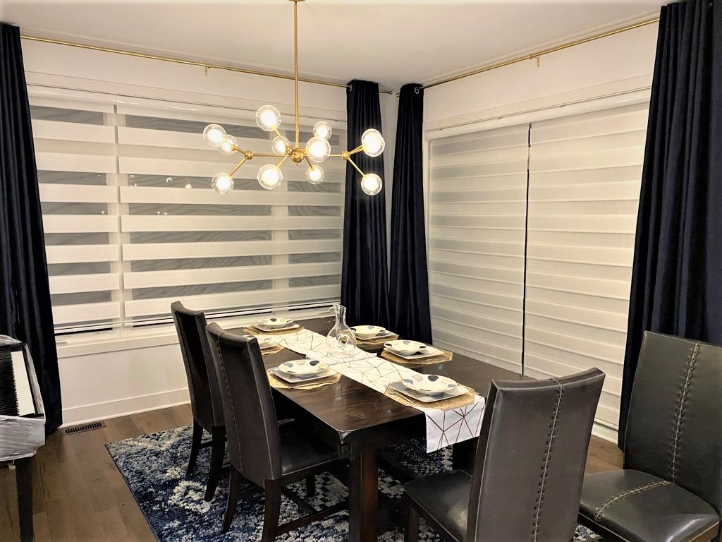 Zebra blinds offer a contemporary look and allow you to control how much natural light comes into the room. It provides an adjustable view.